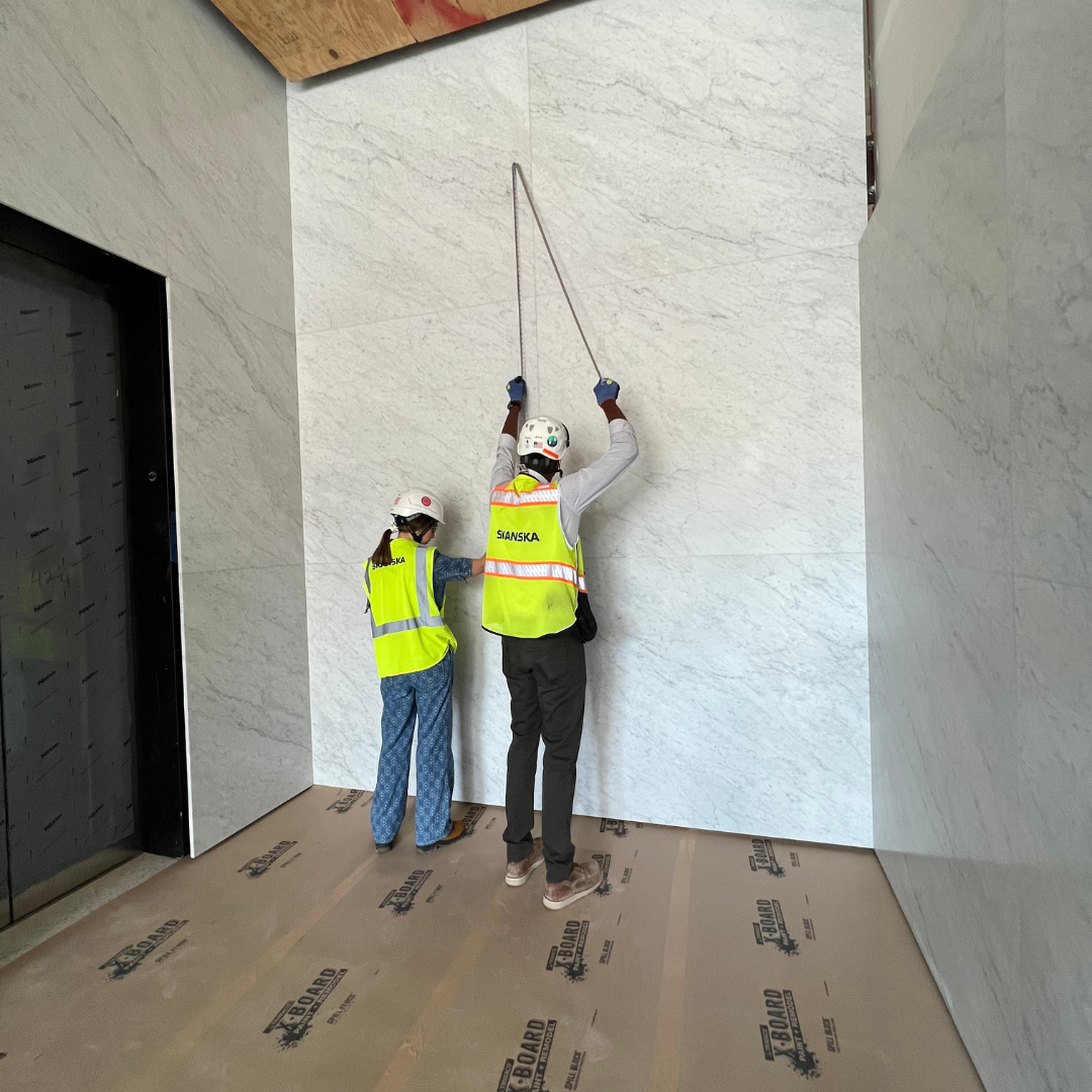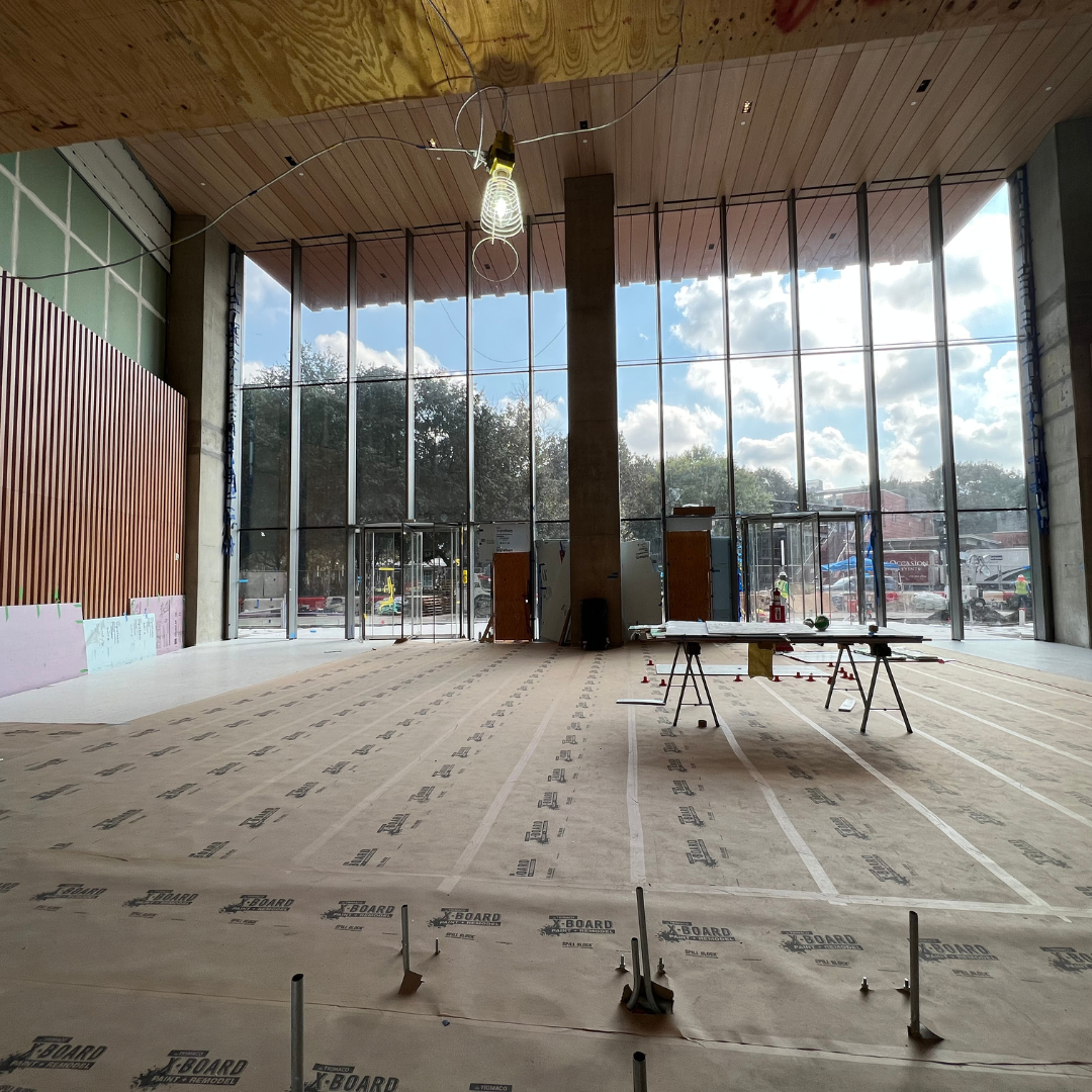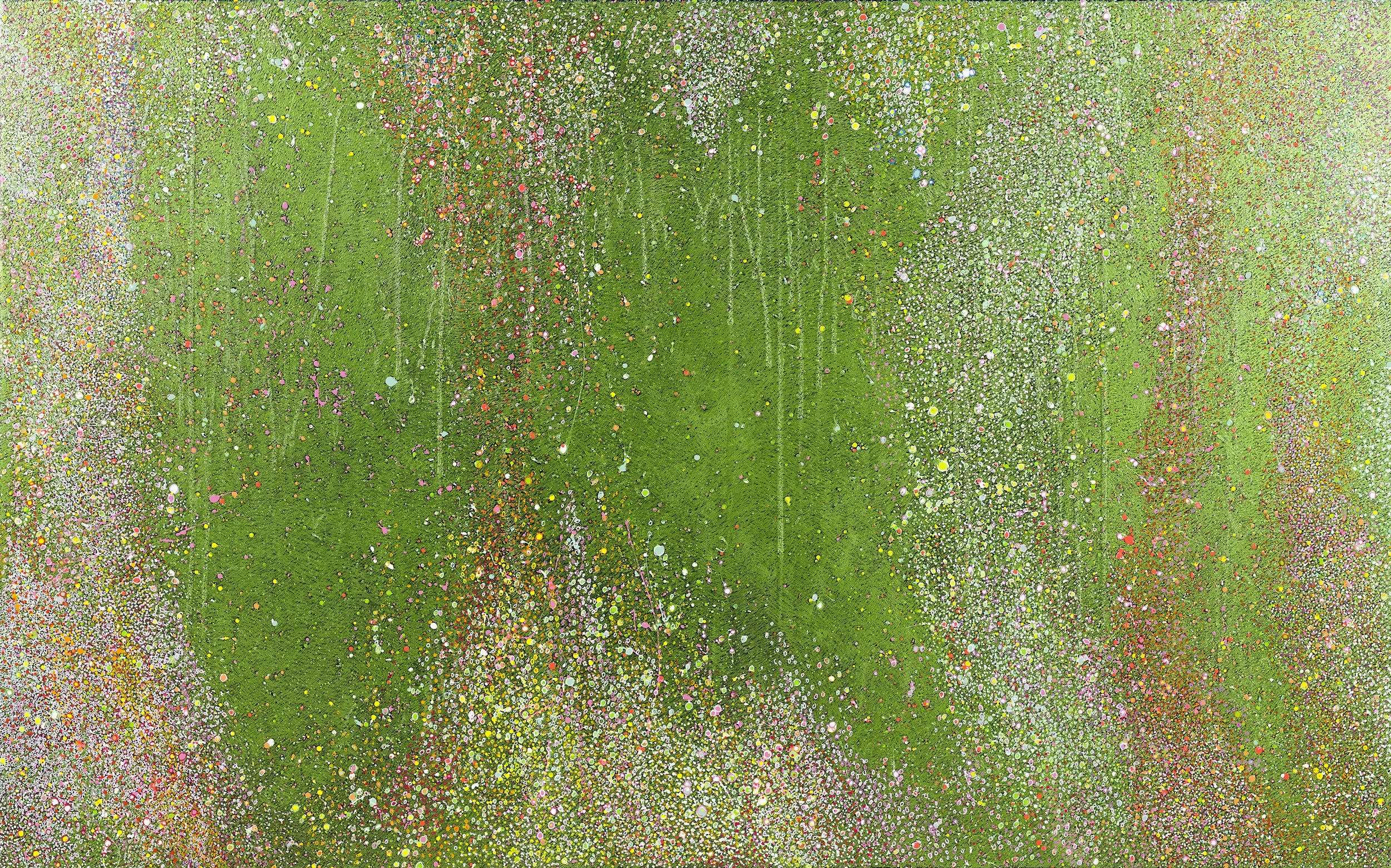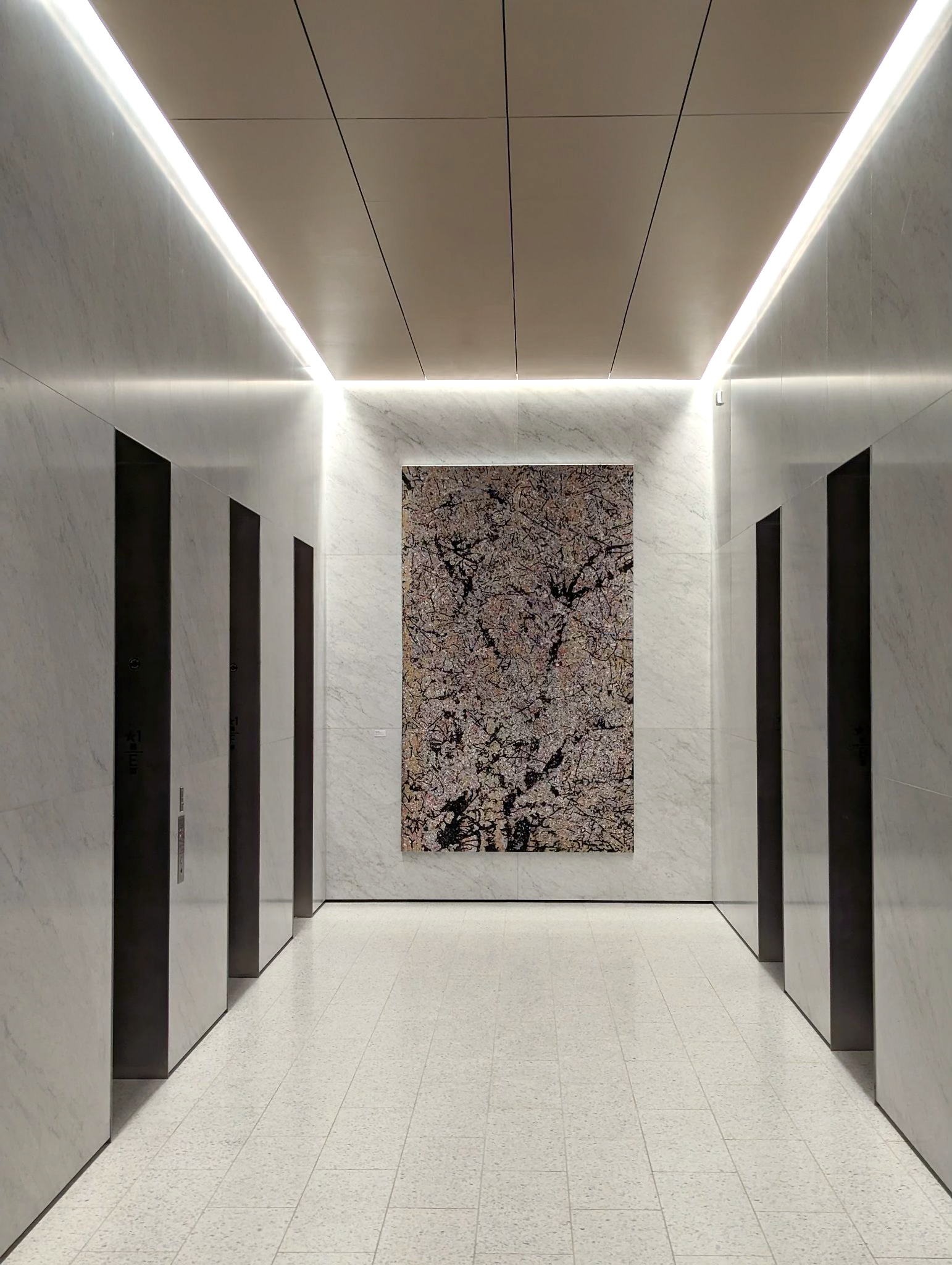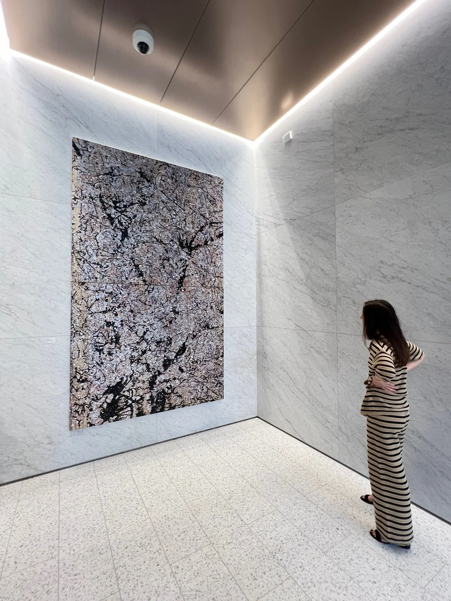 Commissioned for Skanska’s 1550 Building in Houston, in collaboration with Bjarke Ingels Group, this painting is situated where the public space is funneled into the private interior. Large enough to be read from outside the building, it resolves as a single field at a distance and becomes more active and complex up close. In that sense, it is not simply placed within the architecture, but actively engaged with it—shaped by light, movement, and the experience of passing through the space.